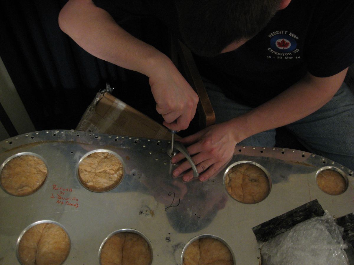 Seriously, though – this tasking was also completed and the panels have been removed. (Why do that, you wonder?) Well, the Panels were showing signs (in a couple of spots) of cracking – and one panel continued cracking past the stop drill. That plus the fact that I would like to get a stencil made of the markings – seeing that we don’t have a blueprint that lists the specific RCAF markings – meant that in the long run it would be better (and safer) to remove these panels now.