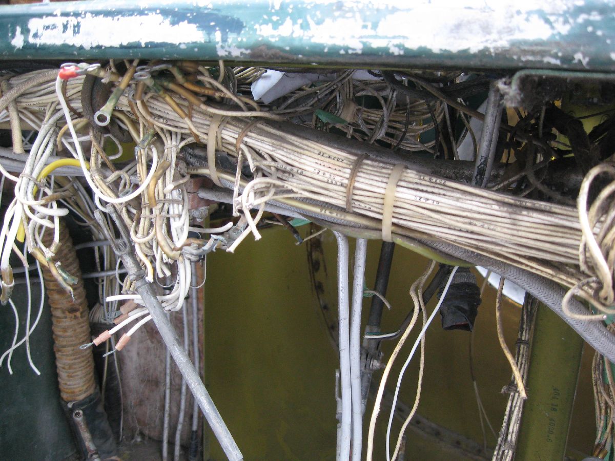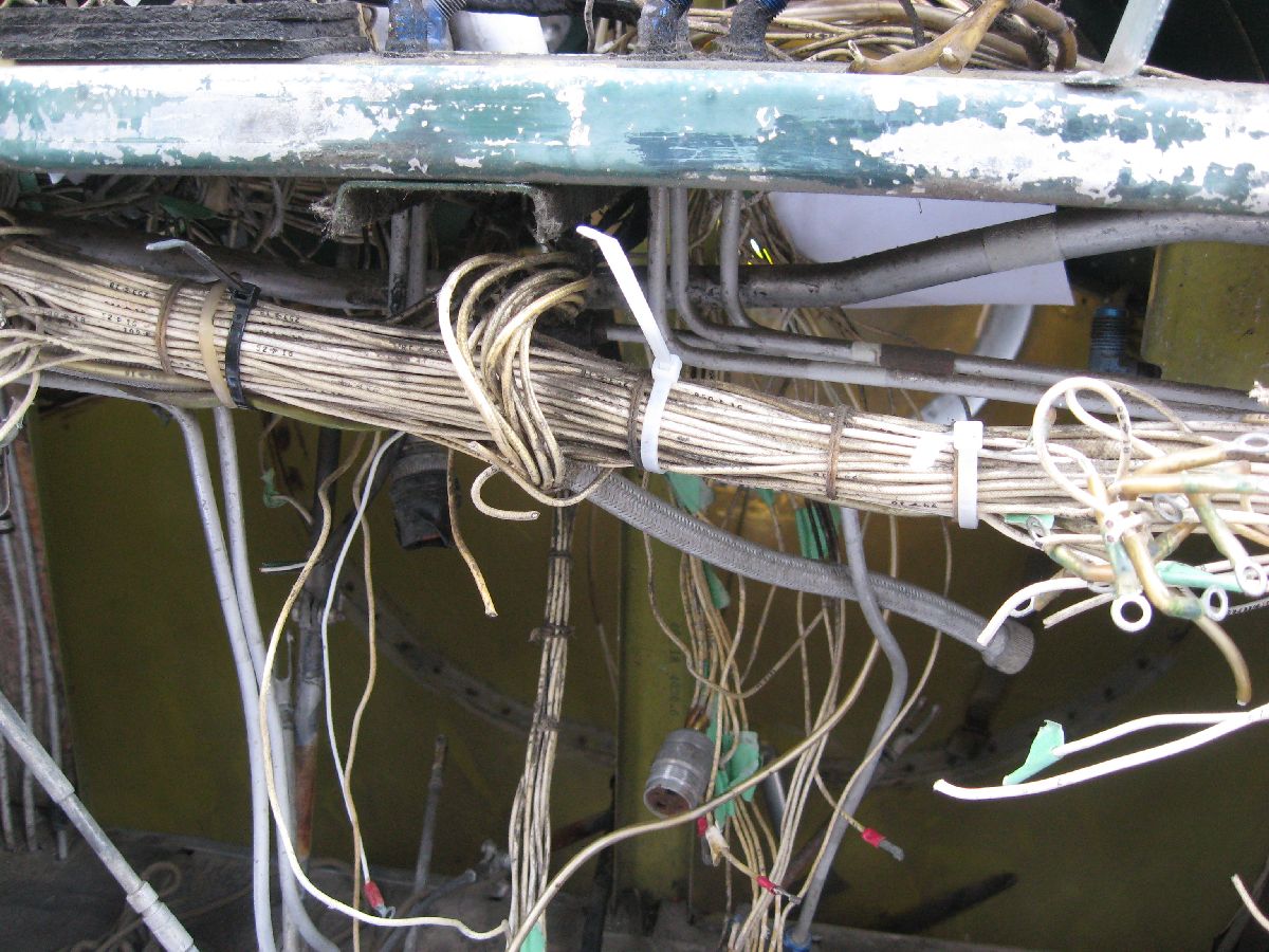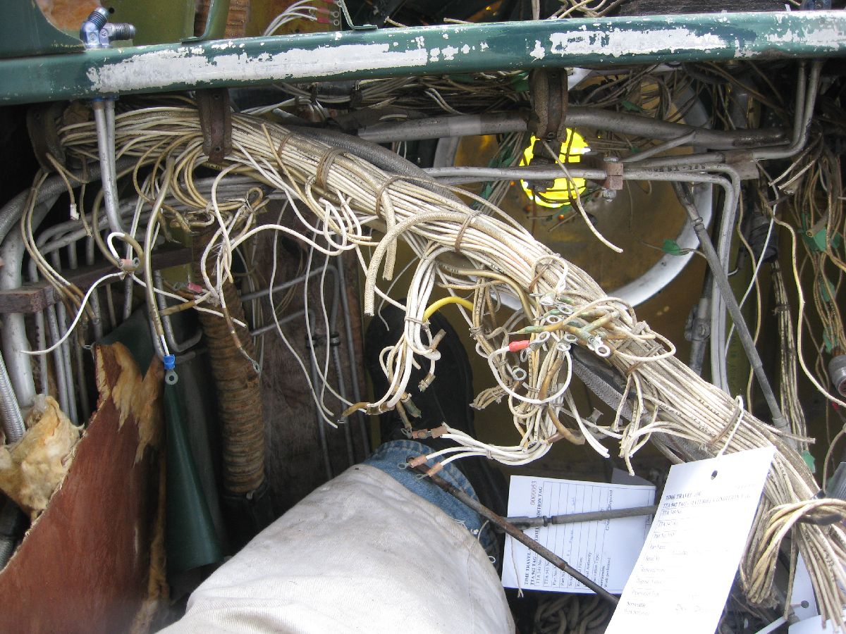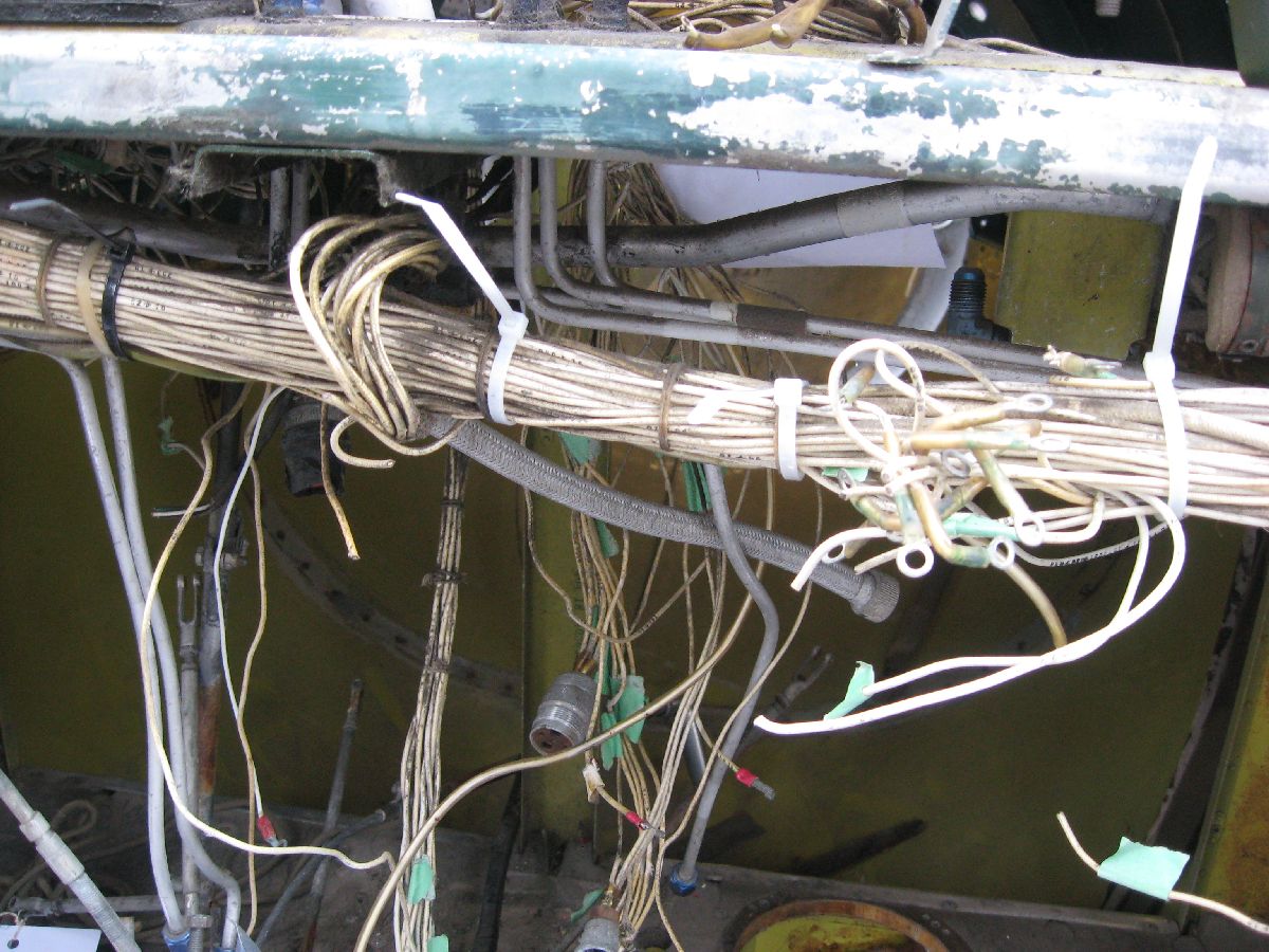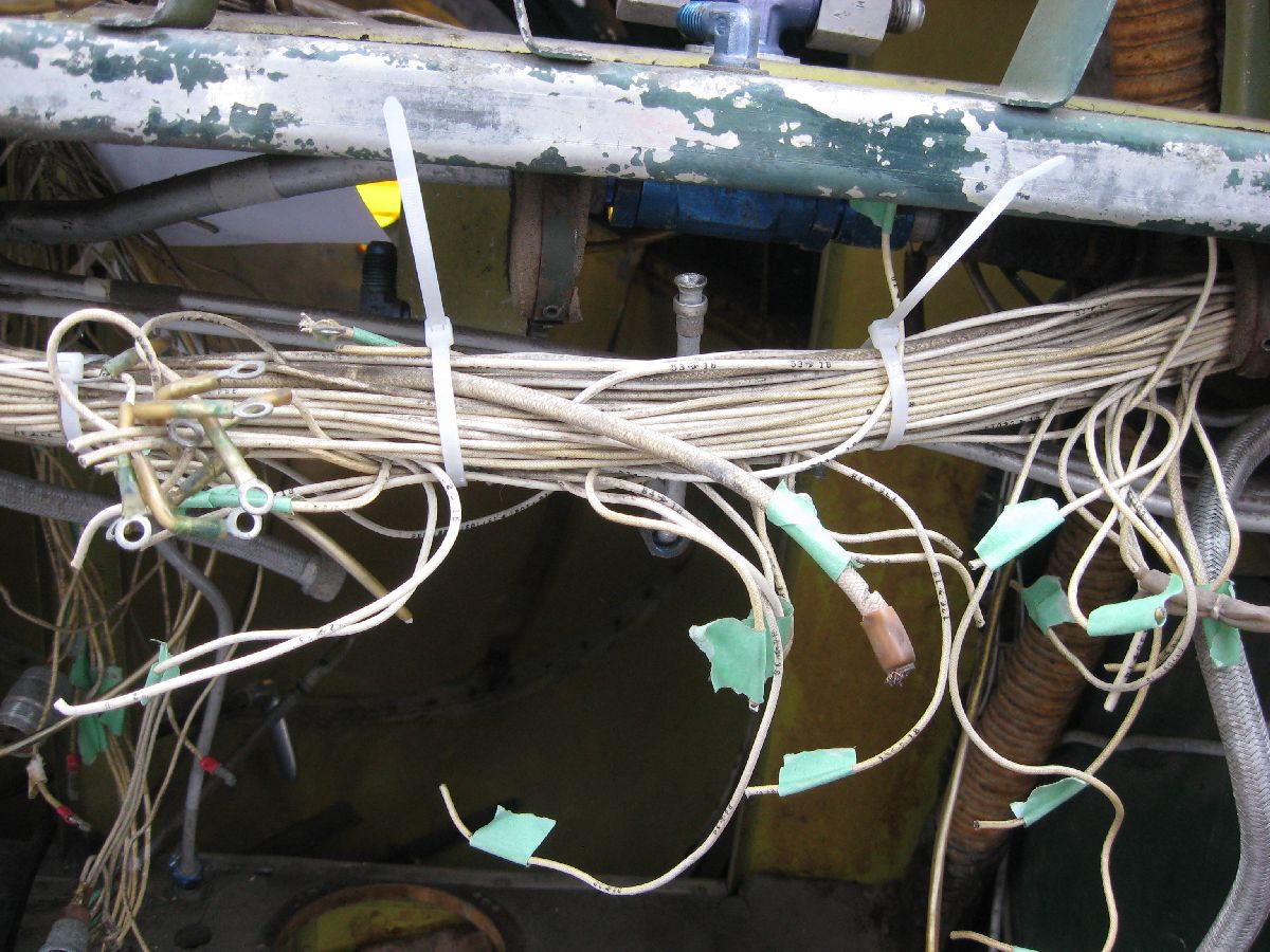 Rather, large bundles of wiring needed to be removed from the cockpit to build up that complete picture. (And, that was something that I wanted to do during MRP 2013 – but, thankfully, I got my chance on this MRP.) So, that’s what I did. I made a point of carefully – very carefully! – labelling each and every wire bundle (plus taking a ton of photos while doing so, as you can see) before I cut the bundles and removed them. Please note, removing bundles like this isn’t something that I was taking in any way lightly – I can appreciate just how much work went into all the electrical wiring that I was cutting. However, something to keep in mind is the fact that the wiring is original to 24 JUL 52, it’s quite heavy (because it’s old), and large portions of the wiring had already been removed due to poor maintenance practises and component removal. I would have preferred to say that I was able to remove all electrical wiring in the whole airplane – after all, that was the tasking! However, the cockpit is almost cleaned out – so I’m going to call this tasking well on it’s way to being completed.